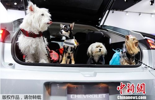 2012年4月11日,美國紐約車展上,雪佛蘭廠商為了宣傳汽車的安全性,請來幾只小狗做起了車模。(來源:中新網)